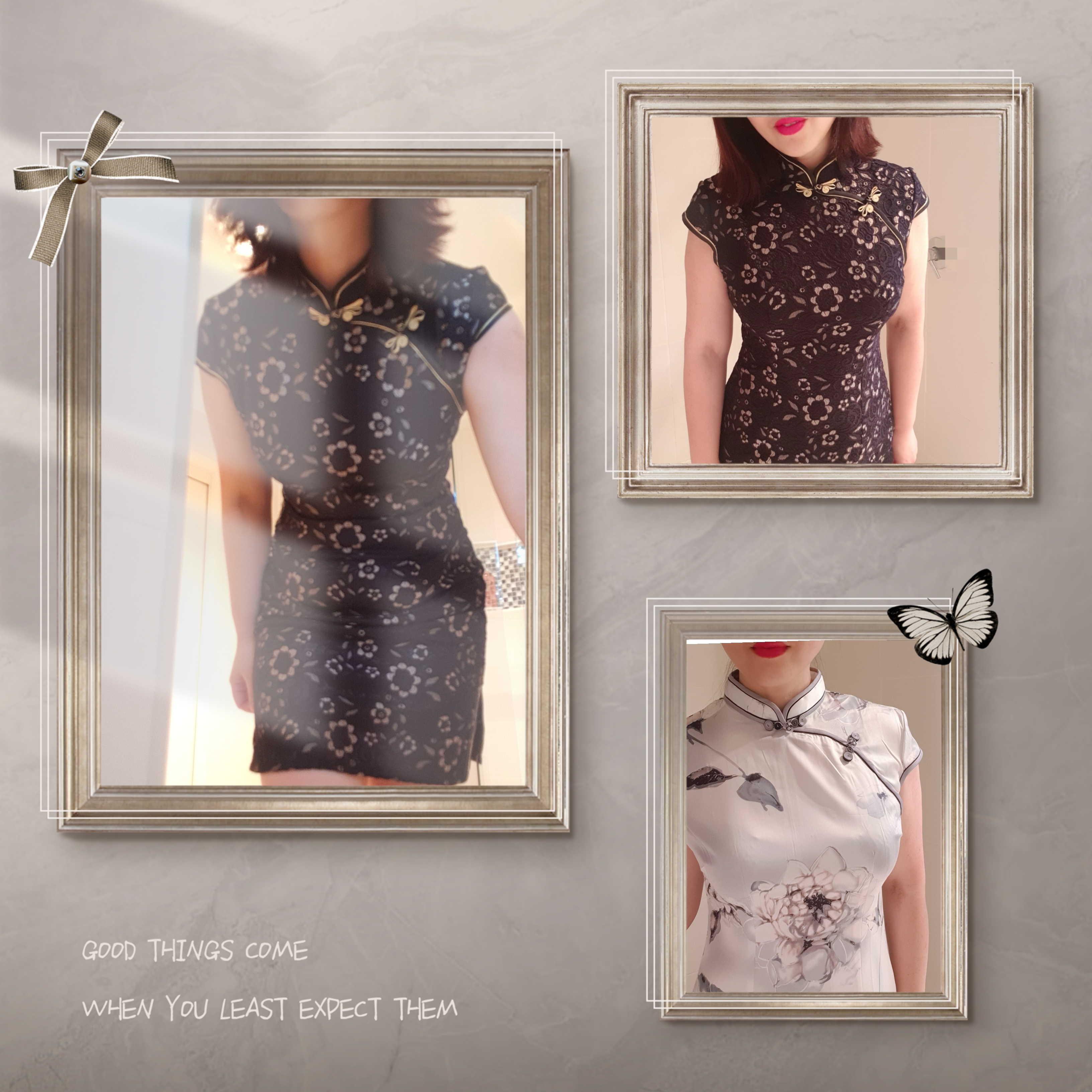 看到下面的贴子提到旗袍,让我想起来衣橱里有几件挂了很久的旗袍。一件是十年前的,还有两件是五,六年前在苏州旅游时买来做纪念品的,除了试穿就从来没穿出去过。下班回家心血来潮拿了出来试试能不能挤进去。十年前的那件还是太瘦了,要吸气才拉得上。估计要再瘦三公斤才能穿。不过另外两件还是挺合身的。
