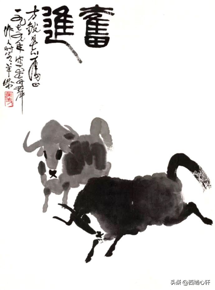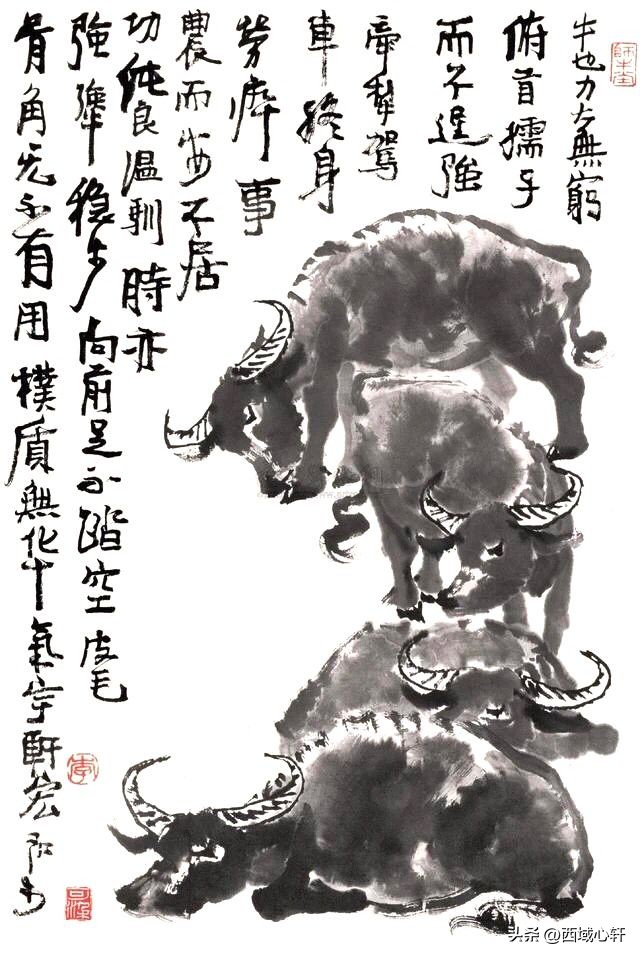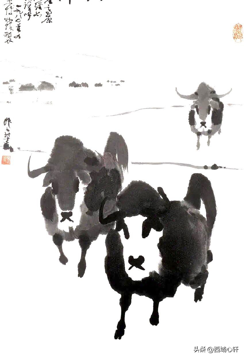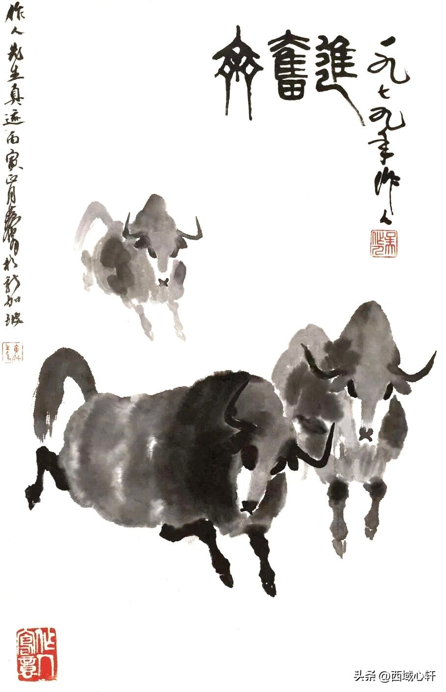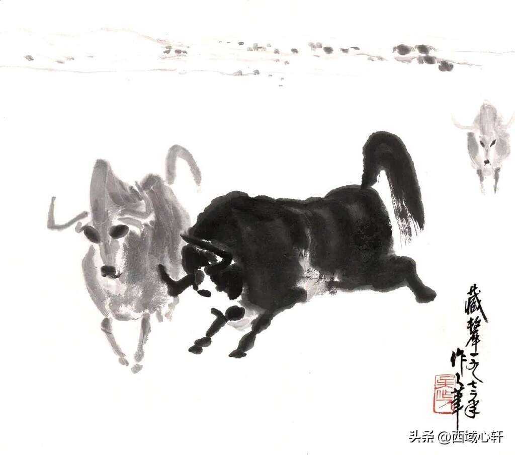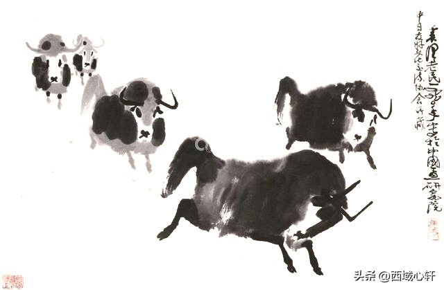 吴作人先生画的牛,更有自己的特色。他画的更像是藏区的牦牛,给人感觉充满了顽强的斗志和生命力,成群结队奔跑在茫茫雪域高原。他笔墨简练概括,不拘形似,高度神似,表现出一种运动、雄强的美,他的画就是为高原生命唱出的赞歌。