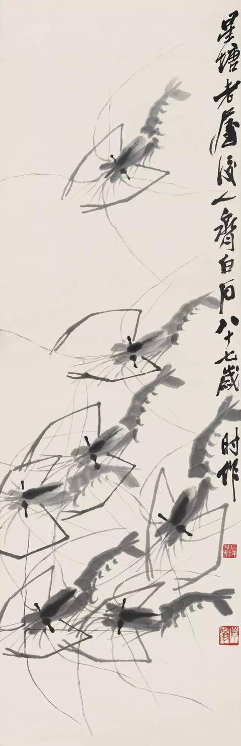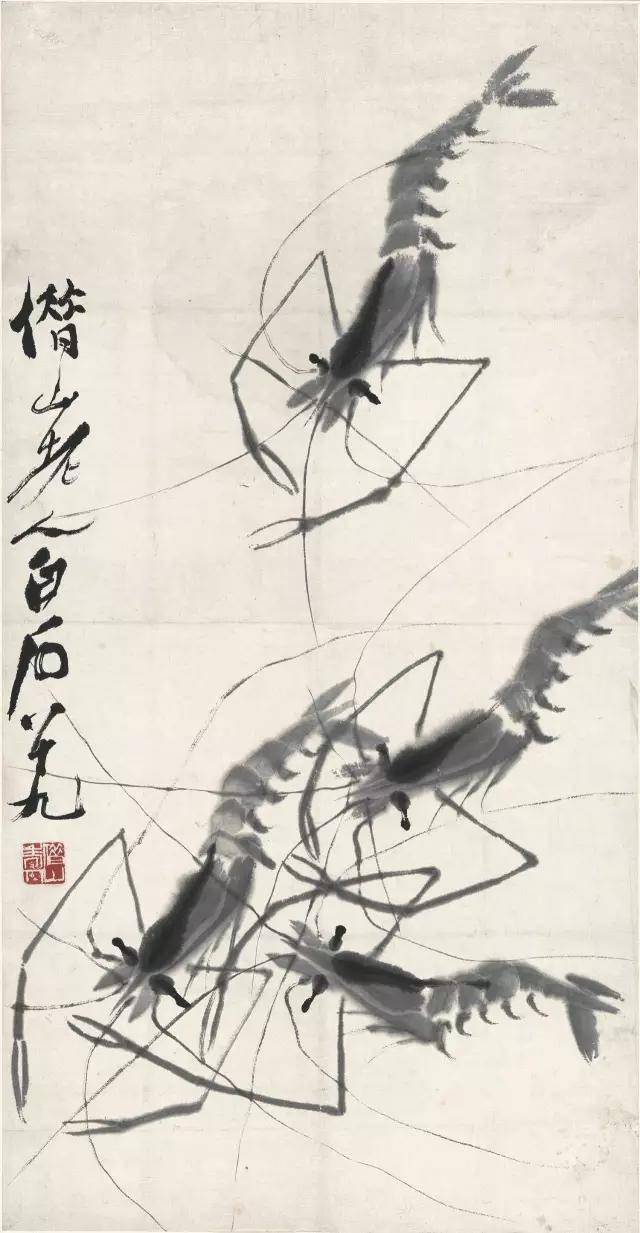 齐白石的绘画作品以山水、花鸟、人物为主要题材,笔墨简练生动,色彩鲜明和谐。他的绘画风格独特,善于捕捉事物的本质特征,通过简练的线条和构图传达出深刻的意境和情感。齐白石尤其擅长画虾,他笔下的虾栩栩如生,形态逼真,被誉为“画坛一绝”。