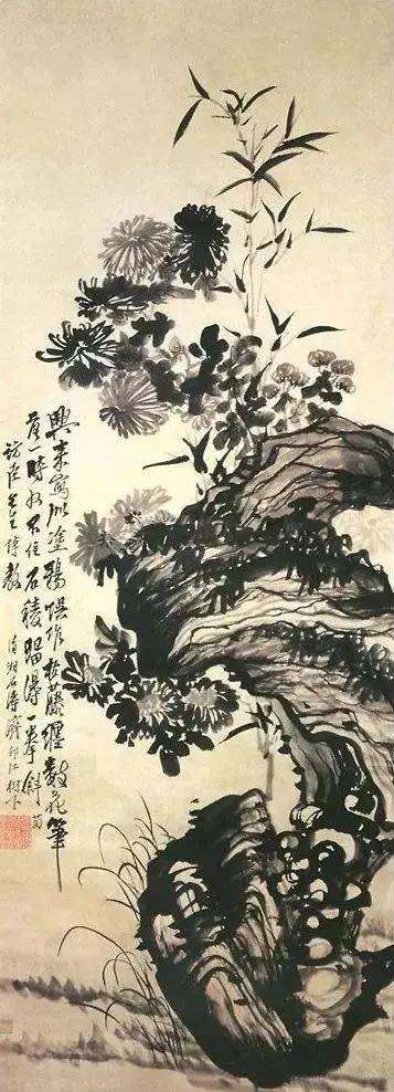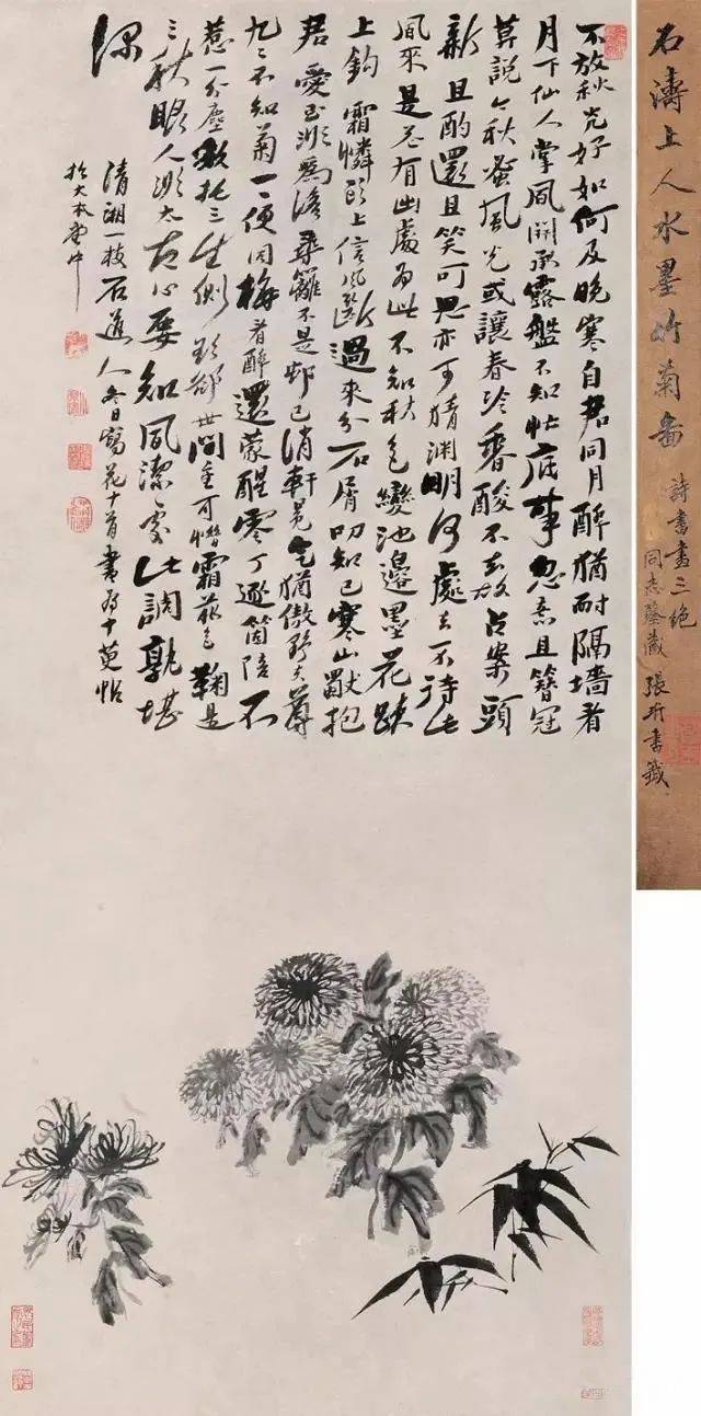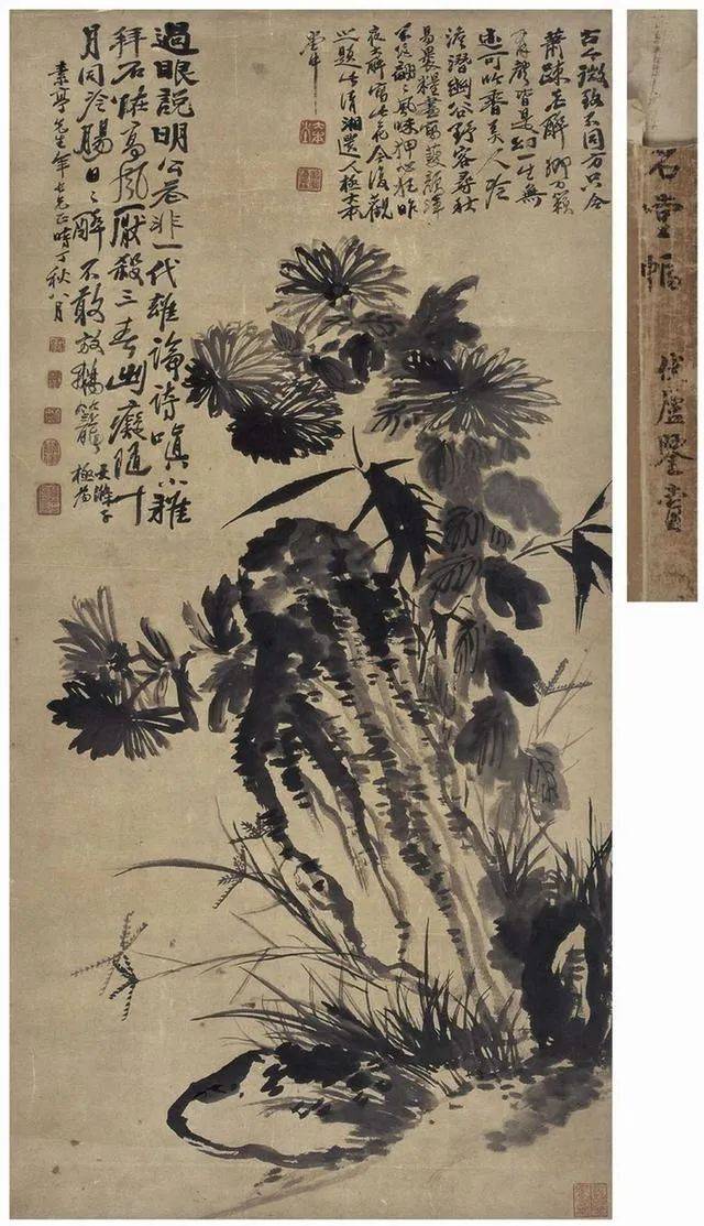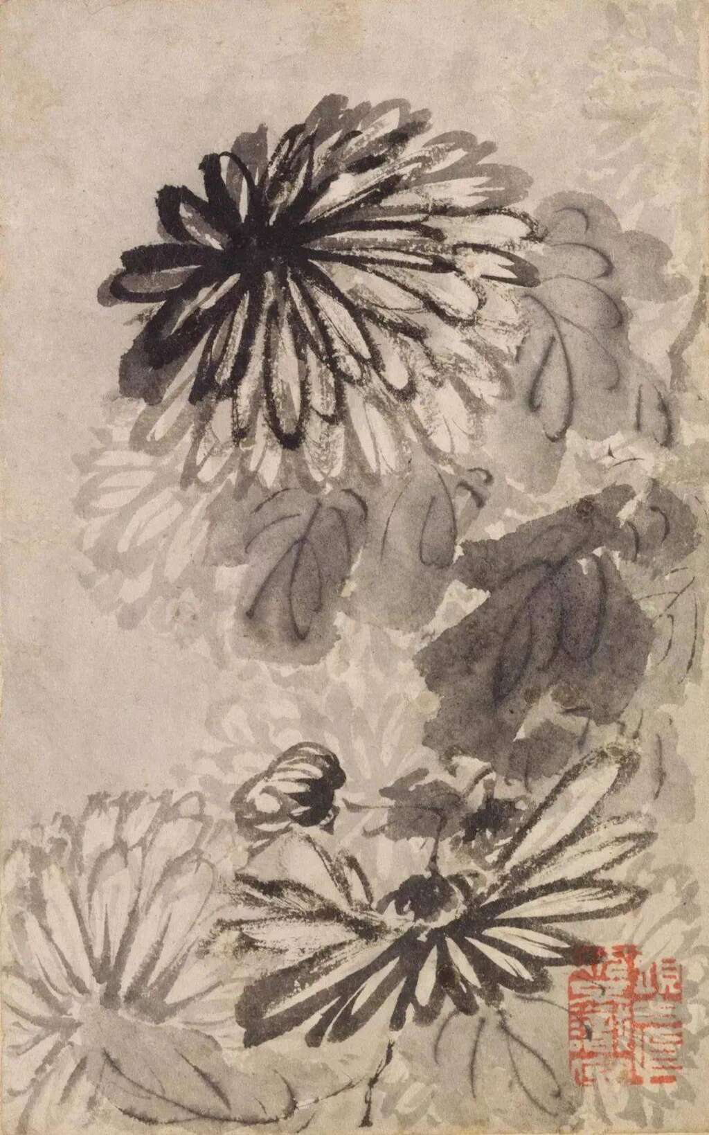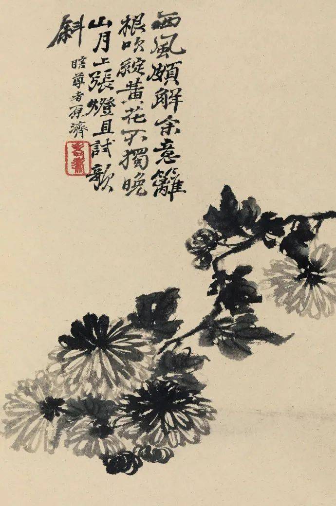 《瓶菊图》是八大晚年时期的杰出作品。运笔用墨以及整幅构图,都在平正简括中显出奇突,一种刚劲兼浑朴的笔调,确是令人玩味不尽!