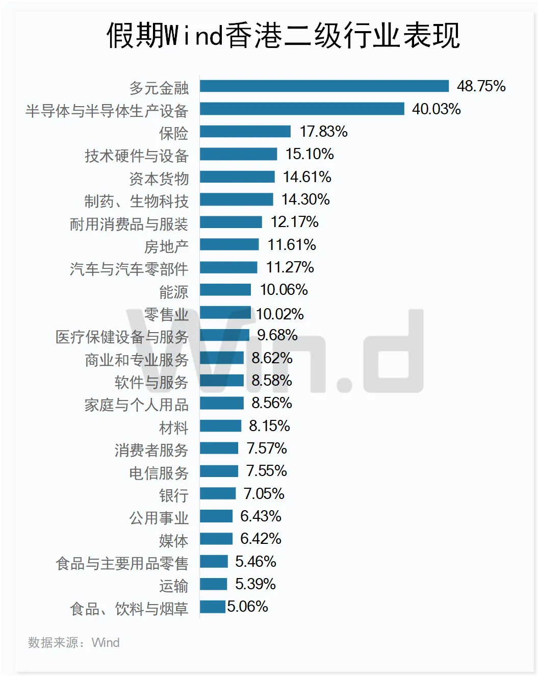 板块方面,Wind香港二级行业中,长假期间香港多元金融行业累计上涨48.75%,位居首位,半导体涨幅同样超过40%。保险、技术硬件与设备等9个行业涨幅超过10%。