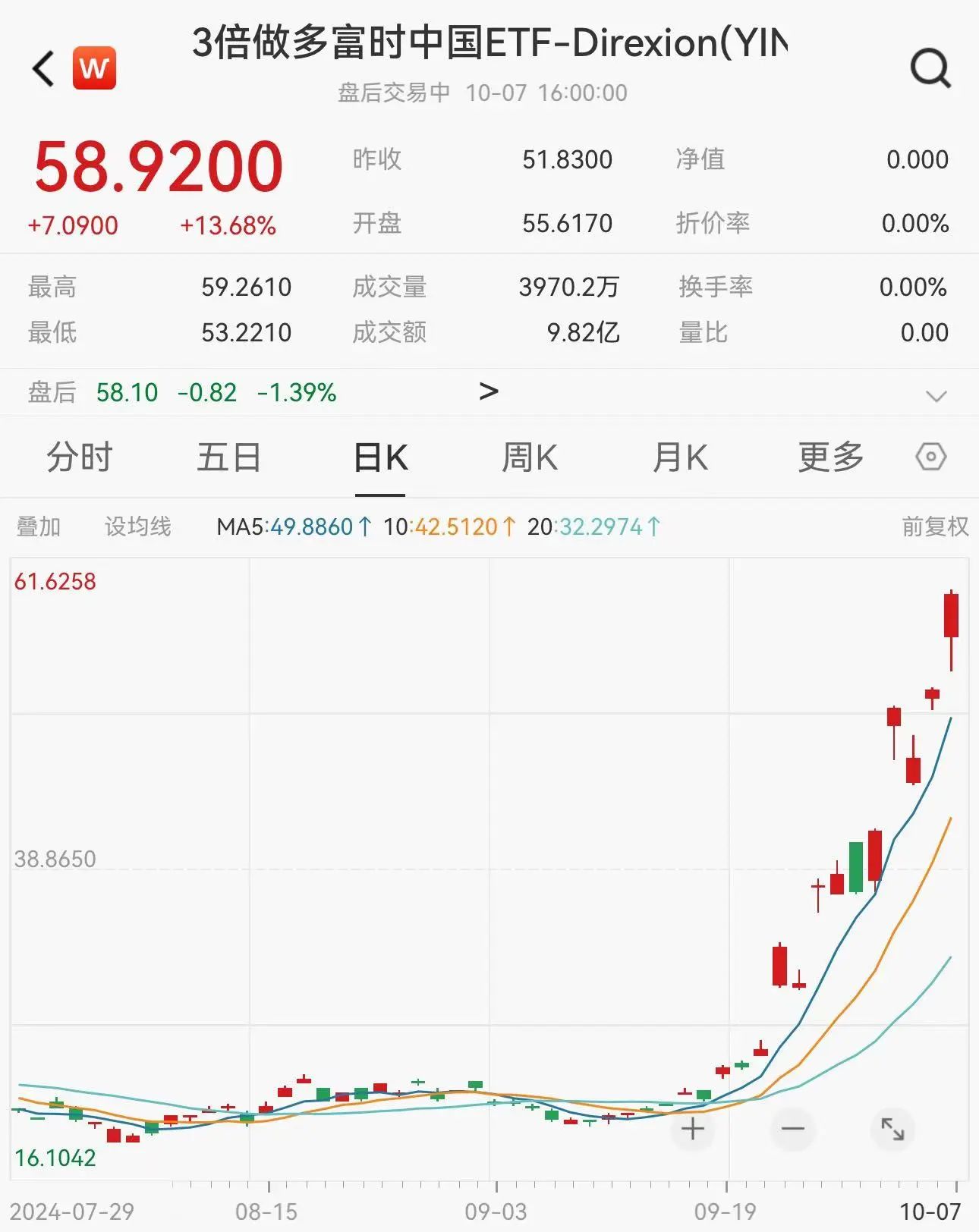 中概股继续保持强劲涨势。10月8日,富时中国A50指数上涨1.98%,iShares MSCI中国ETF上涨4.68%,三倍做多富时中国的Direxion ETF(代码:YINN)涨幅更是高达13.68%。此外,纳斯达克中国金龙指数虽然在10月8号表现平稳,但是自9月30日来已经上涨了11.6%。