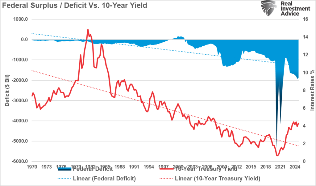 问题在于,我们已经连续四十多年出现赤字,而且目前的赤字水平比五年前还要低。但这正好解释了为何现时的利率比2020年高。