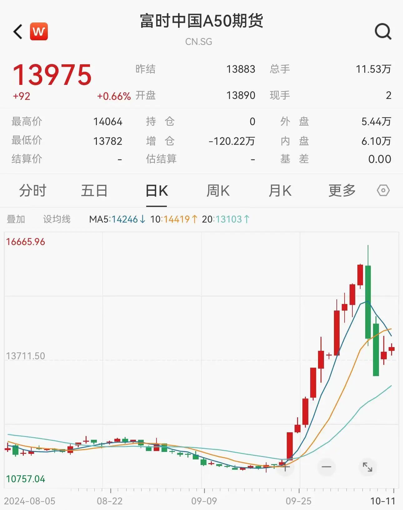 富时中国A50指数期货夜盘收涨0.66%,报13975点。