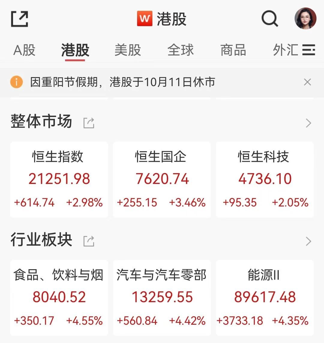 10月10日,港股三大指数早盘冲高恒生指数一度涨超4.7%,午后震荡整理涨幅有所收窄,大市成交额进一步回落。恒生指数收涨2.98%报21251.98点;恒生科技指数涨2.05%报4736.1点;恒生国企指数涨3.46%报7620.74点。港股周五因重阳节休市,恒指本周跌6.53%,恒生科技指数周跌9.39%。