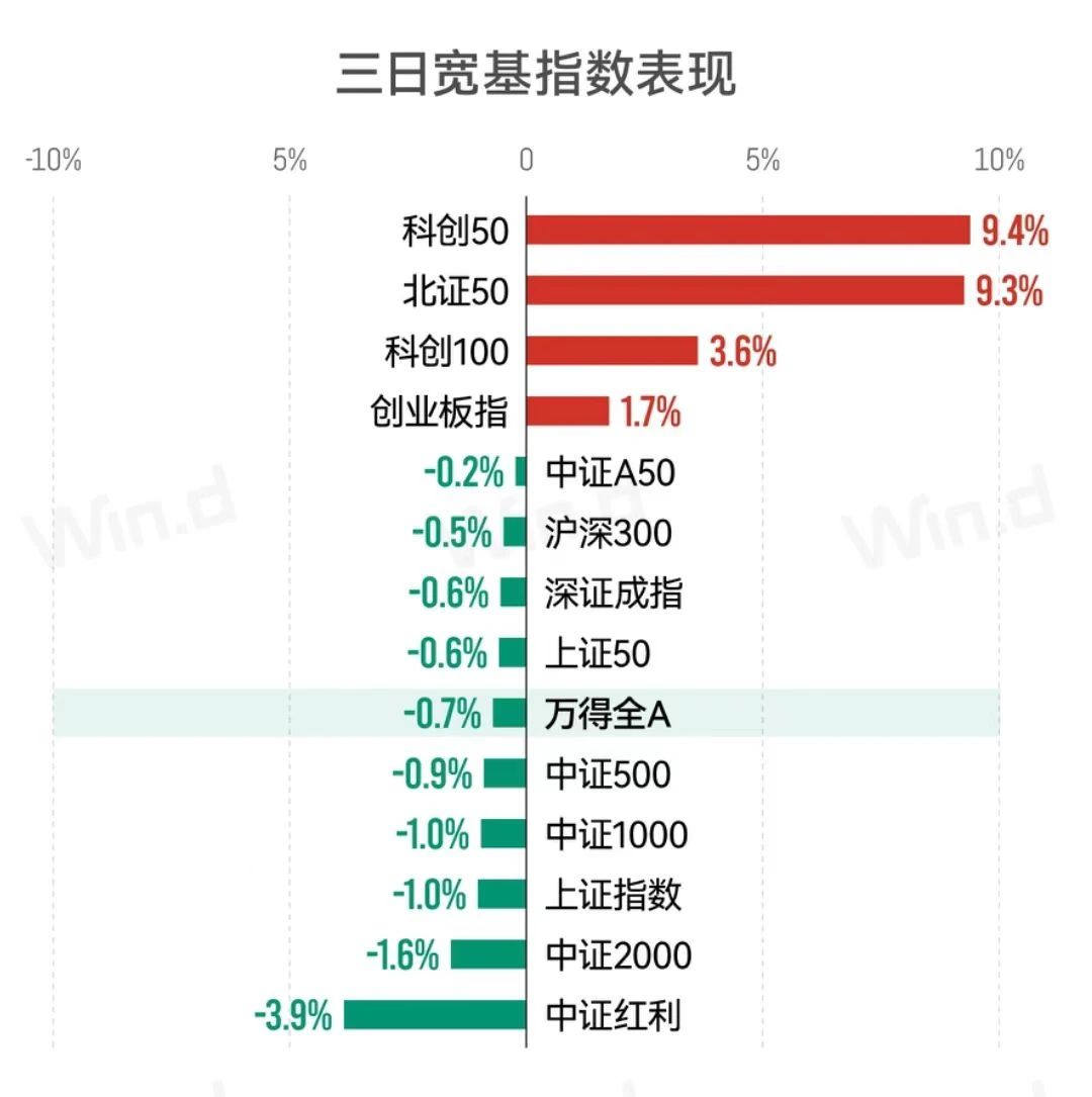 10月10日,A股三大指数分化,上证指数尾盘回落收涨1.32%,双创指数跌幅较大。节后三个交易日,万得全A累计下跌0.7%,科创50与创业板指数涨幅收窄至9.38%与1.74%,中证红利累计下跌3.88%。