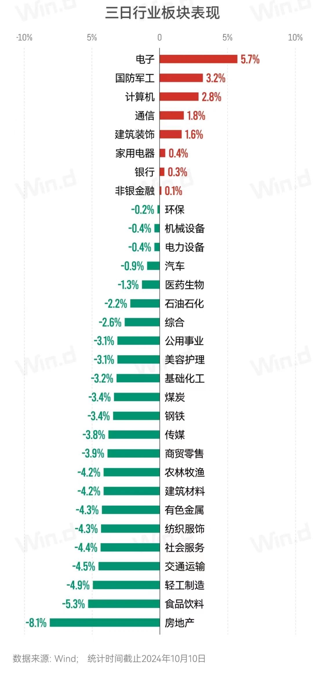 行业板块严重分化,近三个交易日电子、国防军工、计算机、通信、建筑装饰、家用电器、银行和非银金融等8个行业总体实现上涨;房地产、食品饮料、轻工制造、交通运输等多数行业陷入调整。