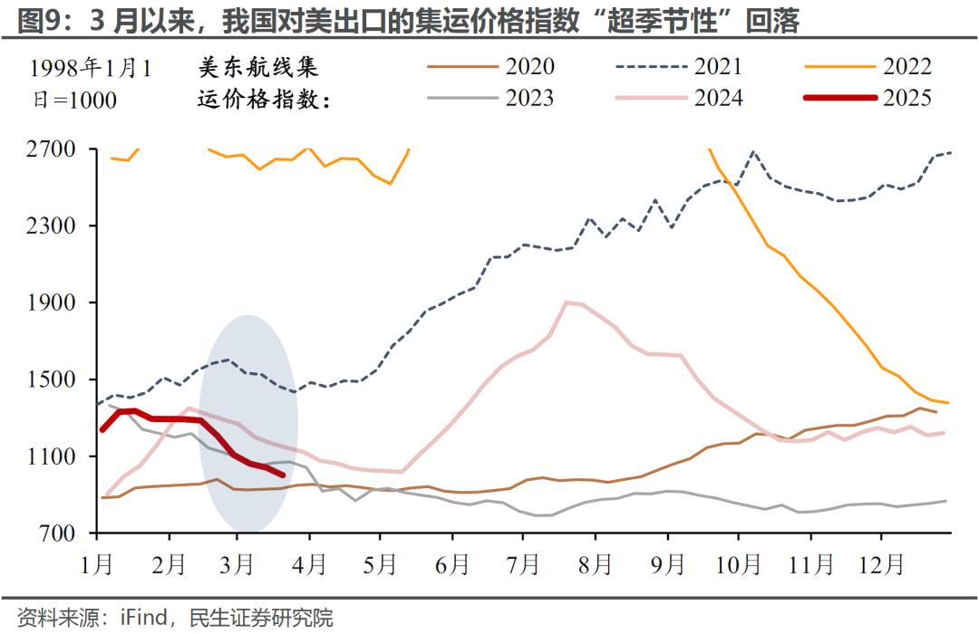 对美出口的转弱“信号”也有所体现。若剔除春节效应,今年1-2月的出口实际上略好于“季节性”,但对美出口表现弱于“季节性”,可能已部分反映了关税的影响。3月以来,以美东航线为代表的集装箱运价指数持续下滑,或进一步预示我国对美出口的景气回落。
