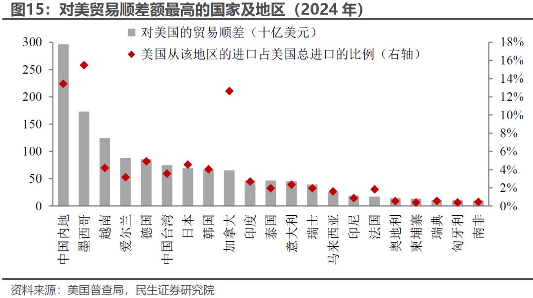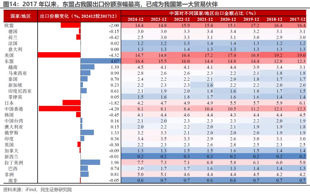 美国“对等关税”会否进一步纳入东盟国家,可能是我国出口最大的“未知风险”。一方面,东盟已超越美、欧成为我国最大的贸易伙伴,2024年其占我国出口份额升至16.4%,高于美国、欧盟的14.7%、14.4%。另一方面,从“高贸易顺差”的标准看,越南、马来西亚等东盟国家可能成为加征“对等关税”的对象。考虑到关税计算公式的高度不确定性,美国可能借此加大对于东盟的关税威胁、“转口”审查力度等。