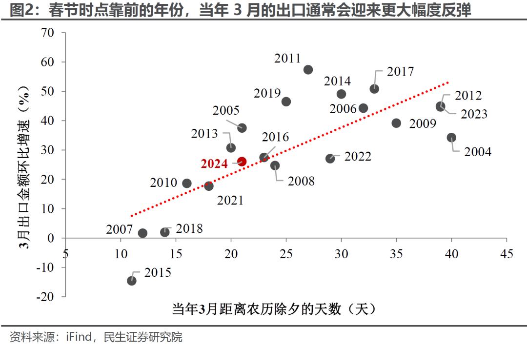 在经济数据层面,3月可能还观察不到出口的下行压力。从历史来看,春节时点靠前往往会压低1-2月出口、抬高3月出口表现;由于今年是“早春”,3月出口可能会较1-2月明显回升(可参照2006、2014、2017年等春节时点与今年相近的年份,3月出口环比均为历史较高水平),并和去年形成“错位”(2024年恰好是“晚春”,3月出口环比较低),进一步放大出口同比读数。
