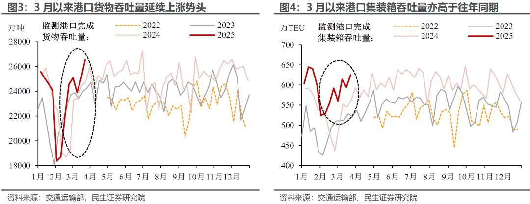 港口货运量等微观数据可作为印证。3月以来,我国监测港口货物吞吐量、集装箱吞吐量持续上升,表现好于往年同期水平。