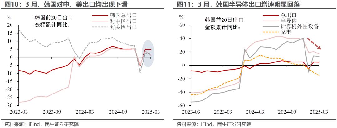 一是作为先行指标的韩国出口出现下行压力。今年3月,美国将韩国列入“敏感国家”清单,限制其获取半导体等关键技术,意图遏制中韩的高技术经贸合作;同时,韩国因对美贸易顺差较高,也是“对等关税”的重点施压对象。3月前20日,韩国对中、美出口累计同比分别由去年末的5.3%、7.3%明显下降至1.2%、2%。细分产品中,半导体出口显著回落,3月前20日累计同比由去年末的38.4%降至17.2%。