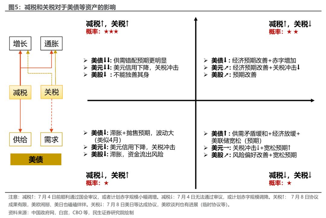 对于市场而言,最重要的问题是被动的缓和是不是真的缓和。我们在之前的报告里介绍了我们的“关税-减税”分析框架。关税被法院叫停,可以看作是关税阶段性的变相缓和:如果该决议能持续,那资产端的表现会往“减税⬆,关税⬇”的区域变化,美债会因为关税收入下降、财政负担上升居高不下,但是利好美元和美股;但特朗普并非“遵纪守法”之人,背叛的怒火仍有可能向外宣泄,导致贸易谈判受阻、重回美国股债汇三杀的局面。