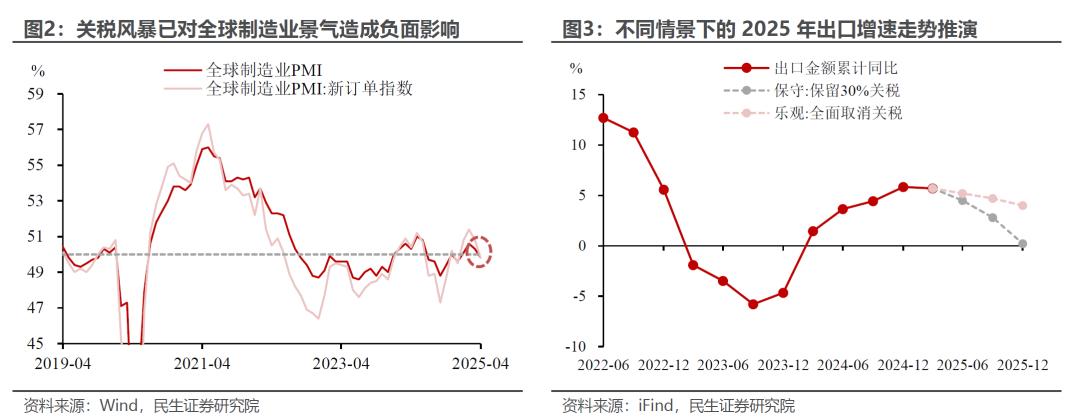 但考虑到近几个月以来,关税担忧下的“抢出口”、“抢转口”等已前置了部分需求,在出口“均值回归”的过程中,后续增长中枢也将有所回落。在全面取消关税的乐观情形下,预计全年出口同比有望实现4%左右的增长。