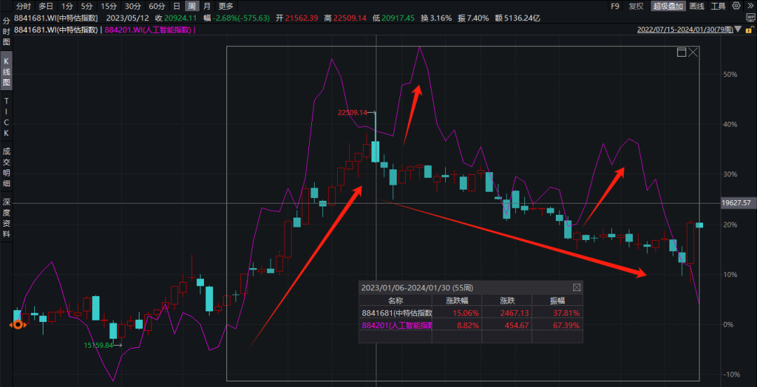 从去年市场资金流向来看,以2023年5月为中特估的变盘点,每当AI指数(高收益风险资产)开始走强,中特估指数就会走弱,即使二者都有一起走弱的时候,但反弹起来的时候,往往AI的表现会更强,尤其是在Q3-Q4时。