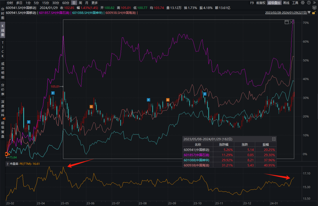 所以一开始市场做多中特估资金分为两派,一方是按照高股息,有能力给予股东更大且穩定回报的公司来买,例如三大运营商、三桶油。