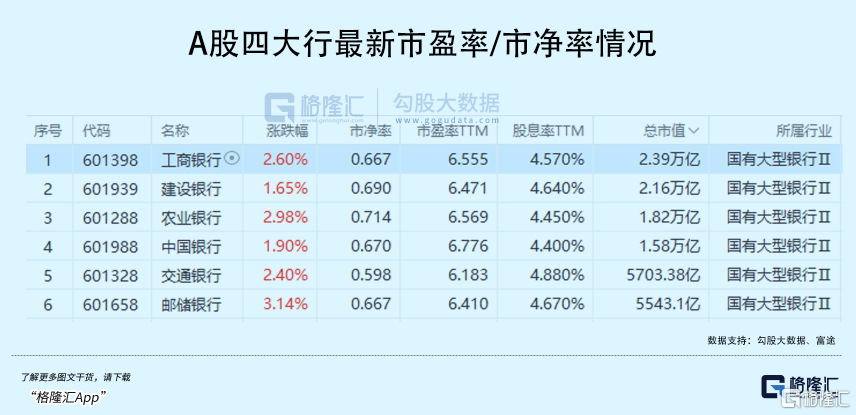 从2023年初到现在,国有大行的整体PE从只有4倍涨到6.3倍;整体PB从0.4倍涨到0.56倍,这个水平。而它们的整体最新股息率,也普遍都还有4.5%上下,还能吊打A股其他99%的行业。