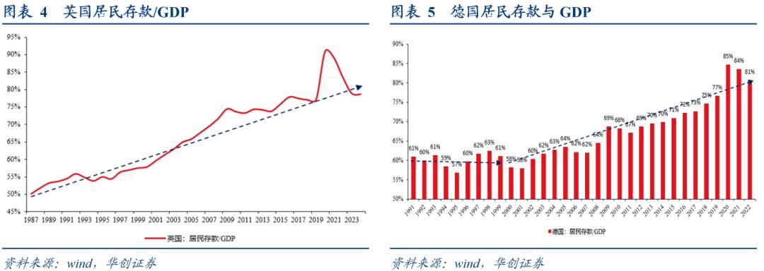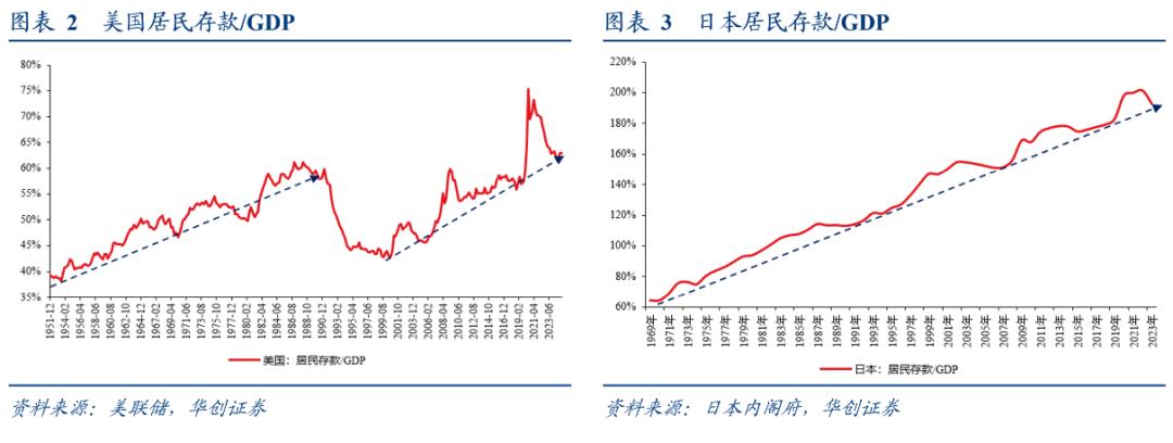 海外经验来看,在居民存款/GDP异常抬升期间,均会呈现均值回归的特点。1950年以来,美国居民存款与GDP的比值有明显的趋势,美国居民存款占GDP的趋势分为两个阶段,第一个阶段是1951年~1990年,美国居民存款/GDP从40%提升至60%,平均下来每年提升0.5%左右;第二个阶段是1999年~2024年,这一阶段美国居民存款/GDP从44%提升至63%,平均下来每年提升0.8%左右。当居民存款与GDP比值超趋势抬升之后(2000年~2003年,2006年~2009年,2020年~2021年),都会形成一到两年的均值回归。