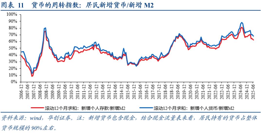 指标状态:当下货币的周转边际改善,但仍处于周转效率偏低的阶段。2022年年初,居民新增存款占新增M2比重约为50%,此后这一比例持续抬升,2024年6月突破历史最高点,2024年7月和8月达到历史最高的80%;2024年9月以来,该指标持续回落,截至2025年7月,该指标降至62%,位于2006年以来约3/4的历史分位数,2020年~2021年,该指标均值55%,2016年~2019年,该指标均值43%。
