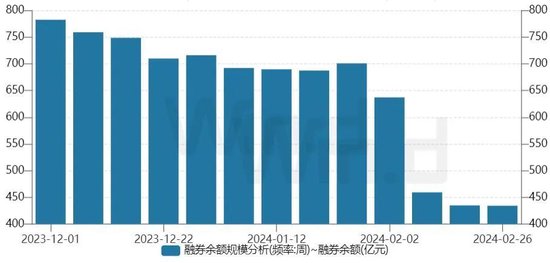 2023年12月上旬,市场融券余额尚有近800亿元,此后缓慢下滑,2024年2月6日之后,融券余额进一步快速下降。