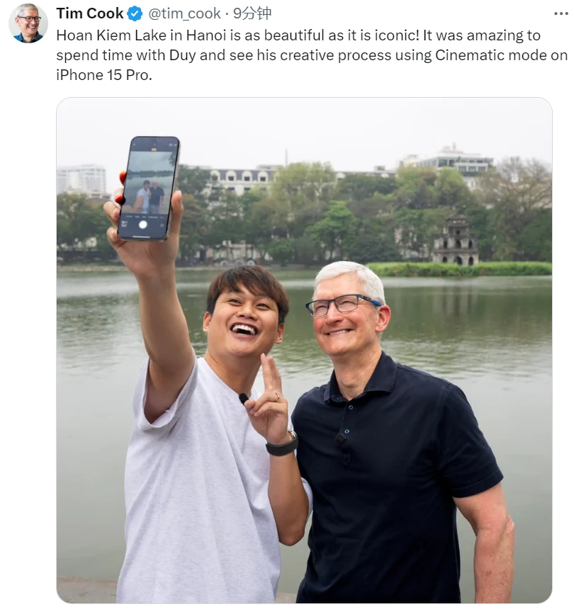 北京时间周一午后,苹果公司CEO蒂姆·库克在社交媒体上发布多张“人在越南”的照片:与音乐家一起品尝河内特色的蛋(黄)咖啡,并与影视创作者一同在当地著名的还剑湖边用iPhone后置摄像头合影。