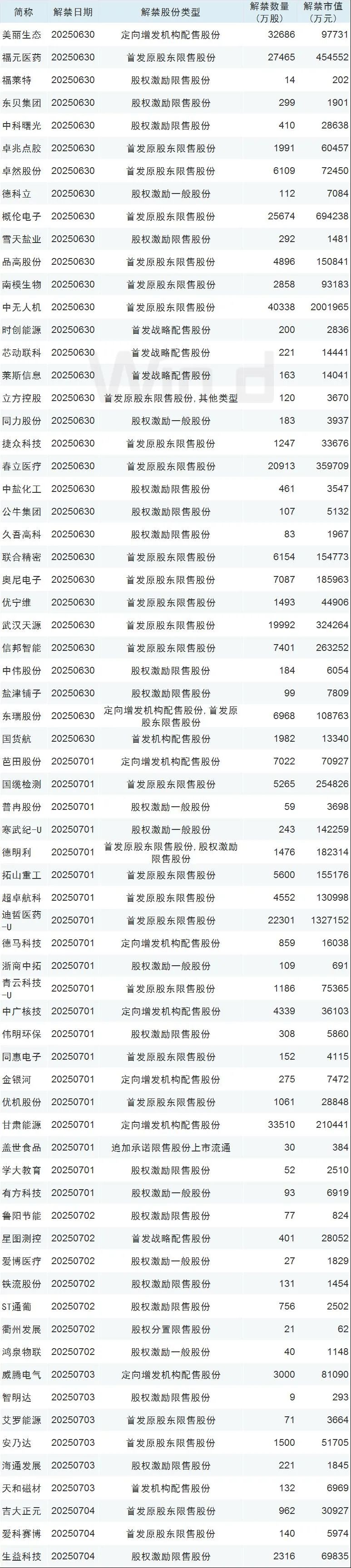 从解禁市值来看,6月30日是解禁高峰期,32家公司解禁市值合计521.69亿元,占本周解禁规模的63.88%。按6月27日收盘价计算,解禁市值居前三位的是:中无人机(200.2亿元)、迪哲医药-U(132.72亿元)、概伦电子(69.42亿元)。从个股的解禁量看,解禁股数居前三位的是:中无人机(4.03亿股)、甘肃能源(3.35亿股)、美丽生态(3.27亿股)。