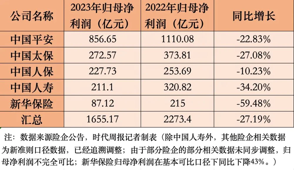 值得注意的是,中国太保和新华保险2023年同时切换至新保险合同准则和新金融工具准则,2022年比较数根据要求追溯调整了新保险合同准则部分,但在新金融工具准则方面选择不追溯调整投资业务相关上年同期对比数据,因此净利润不完全可比。新华保险称,在模拟调整使得2022年数据基本可比的情况下,2023年归属于母公司股东的净利润同比下降43%。