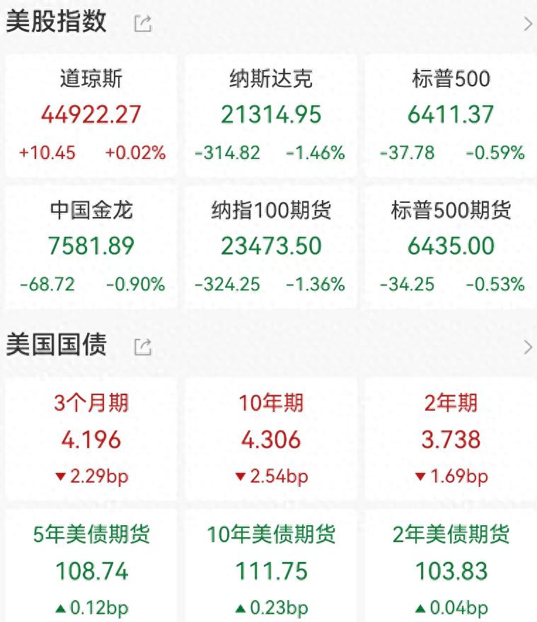 美国标准普尔500指数下跌0.59%,收于6411.37点;纳斯达克综合指数跌幅更大,下跌1.46%,报21314.95点。相比之下,道琼斯工业平均指数则小幅上涨10.45点,涨幅0.02%,收于44922.27点。在交易时段内,道指一度触及历史新高,主要受到家得宝股价走强的推动。