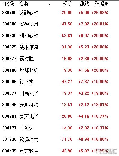 华为概念板块逆势大涨,安硕信息、润和软件、法本信息、银之杰等13只个股涨停,中海达、软通动力涨超16%。
