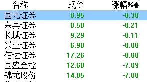券商板块走势分化,国海证券、天风证券涨停,招商证券、东方财富涨超7%,中信证券涨超4%;国元证券、东吴证券、兴业证券等跌超8%,国盛金控、方正证券、中泰证券、中金公司等跌超7%,国金证券、光大证券等跌超6%。