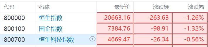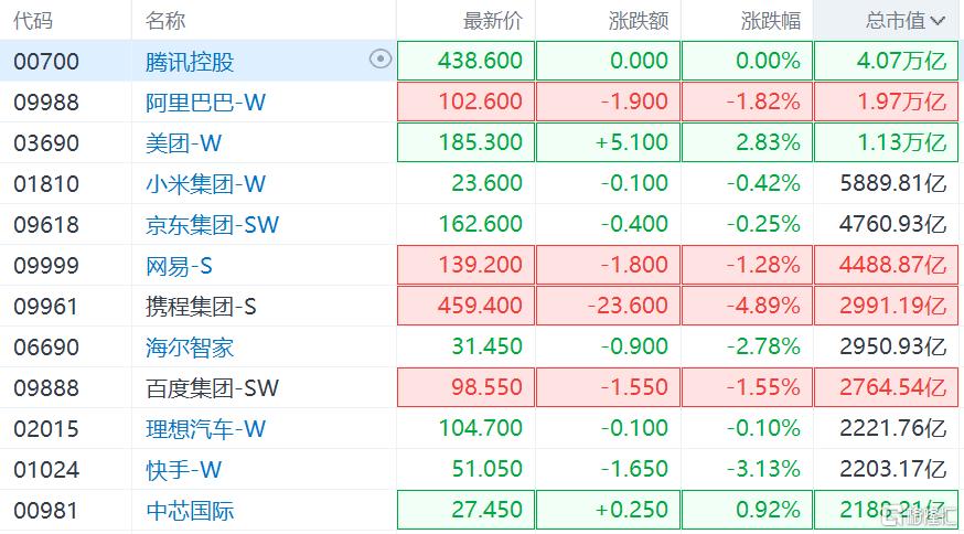 大型科技股多数下跌,快手跌超3%,海尔智家跌超2%,阿里巴巴、网易、百度集团跌超1%,美团涨超2%。