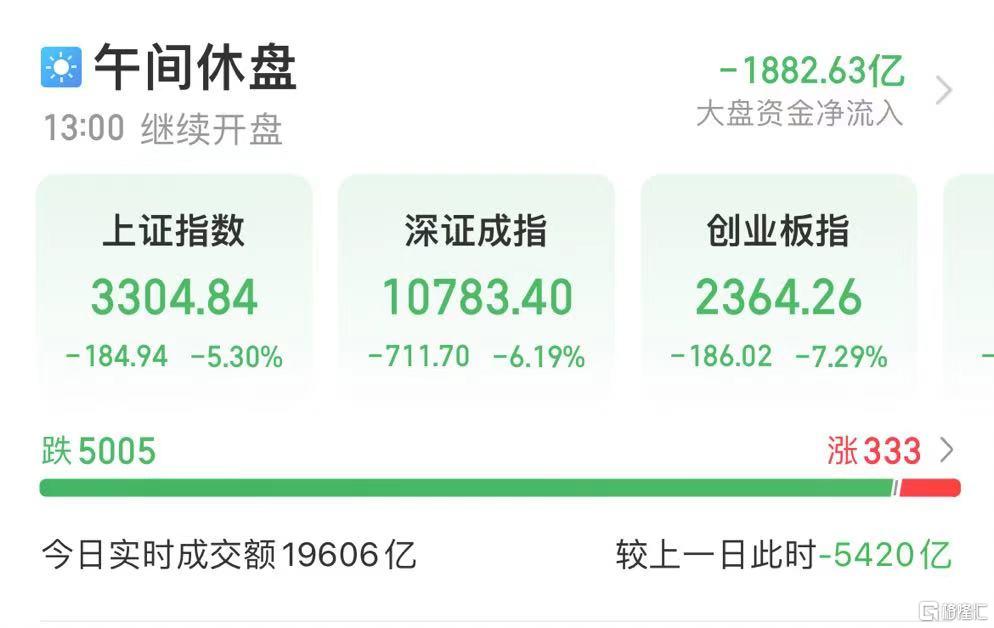 今日,A股开盘大幅下跌,截至发稿,上证指数跌超5%,一度跌破3300点,最新报3304.84点,深证成份指数跌超6%,创业扳指跌7%。