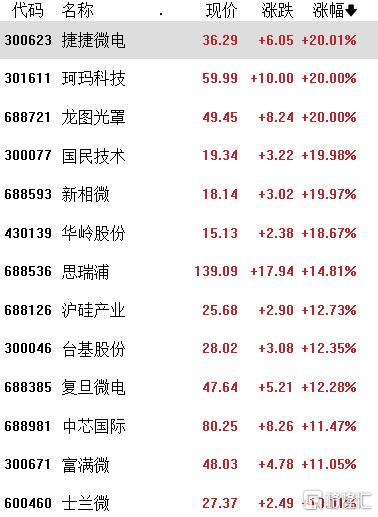 半导体表现强劲,捷捷微电、珂玛科技、国民技术20CM涨停,华岭股份涨超18%,思瑞浦涨超14%,负担微店涨超12%,中芯国际、富满微涨超11%,士兰微、全志科技涨停,芯原股份、东微半导涨超9%,艾为电子涨超8%,上海贝岭、卓胜微涨超7%。