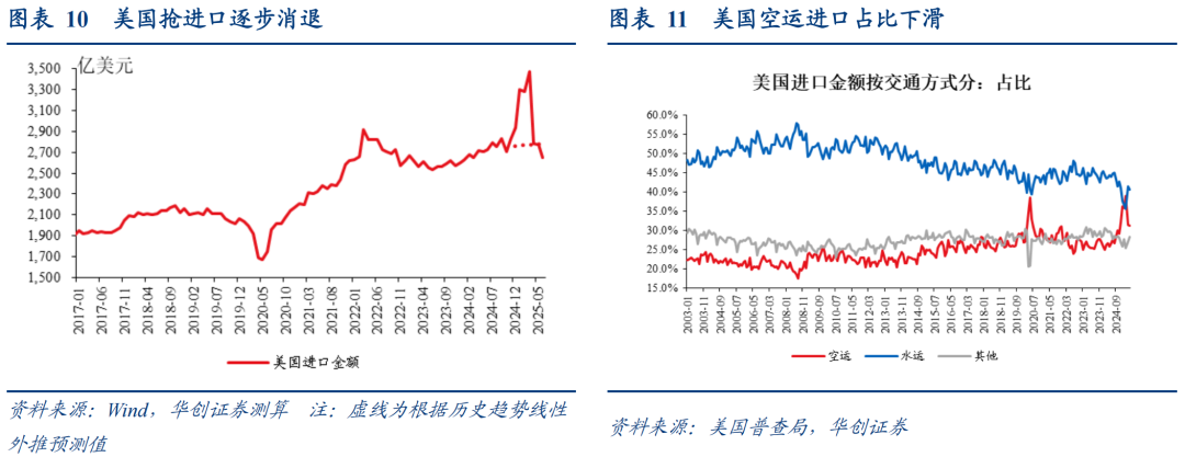参考《关税战下的美国抢进口:规模、区域和结构》的观测办法,估算美国抢进口规模。目前来看,4月开始美国抢进口基本结束,6月或已开始出现需求前置后的进口回调,一方面,4月开始美国月度季调后进口额已经基本持平于历史趋势线性外推值,略较外推值高约4.8亿美元左右,6月时实际值已经较线性外推低约131亿美元。另一方面,美国抢进口的另一个观测指标,空运进口占比4月开始大幅下滑,5月进一步降至31.2%。去年12月-今年6月,美国进口额较历史趋势线性外推值累计仍有约1792.5亿美元的超涨,约为美国2024年月均进口额的65.3%。