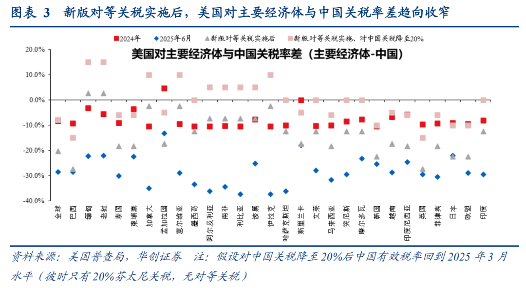 新版对等关税实施或带来中国与其他国家关税率差收窄,降低中国出口的α风险(出口份额转移风险),与此同时,如果美国能降低对华芬太尼关税,或可将中国与其他国家关税率差缩窄到接近特朗普2.0关税实施前水平。