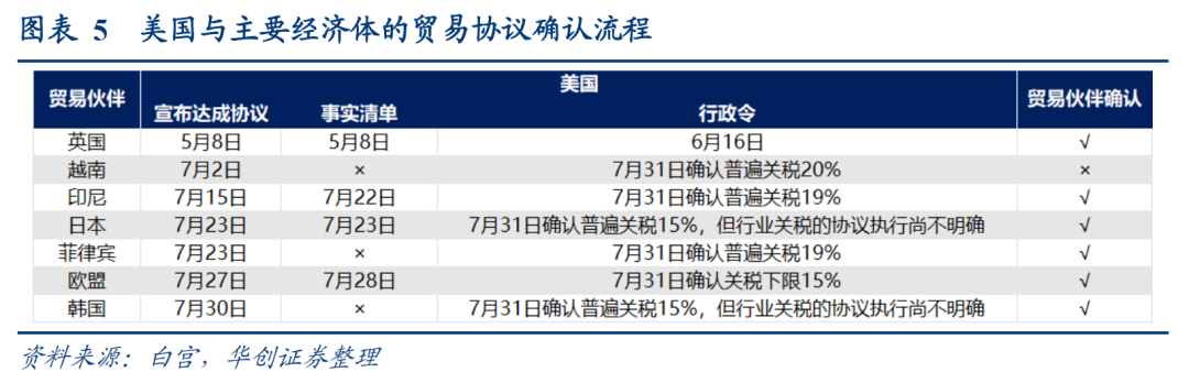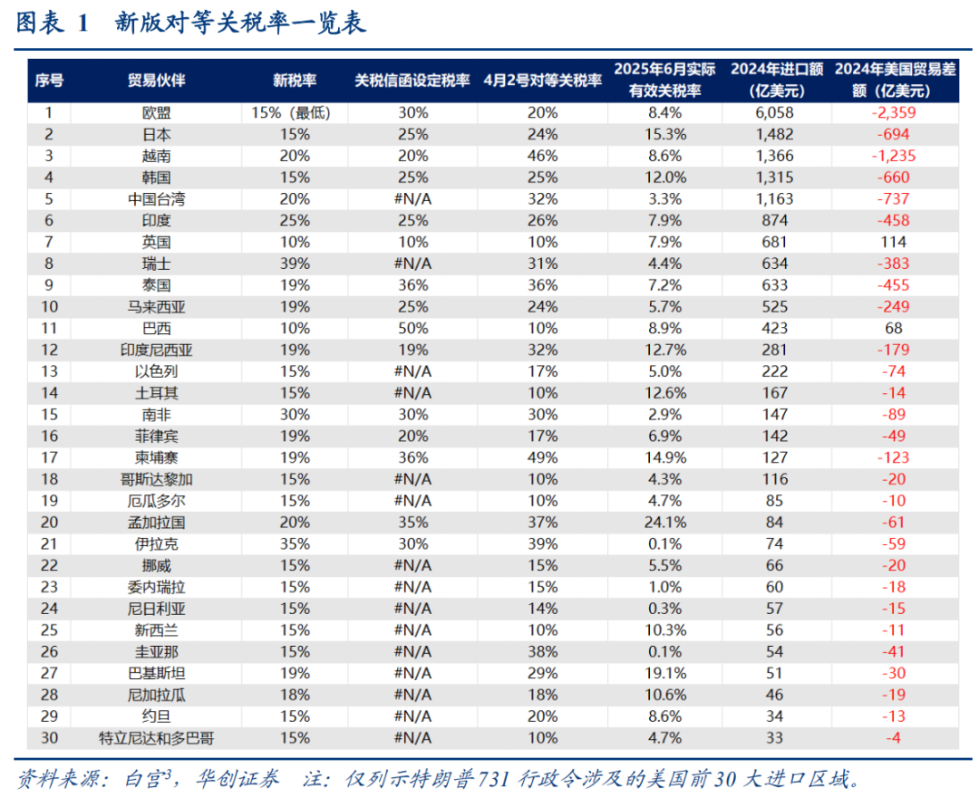 1、新版对等关税于8月7日生效,逆差经济体10%,顺差经济体最低15%
