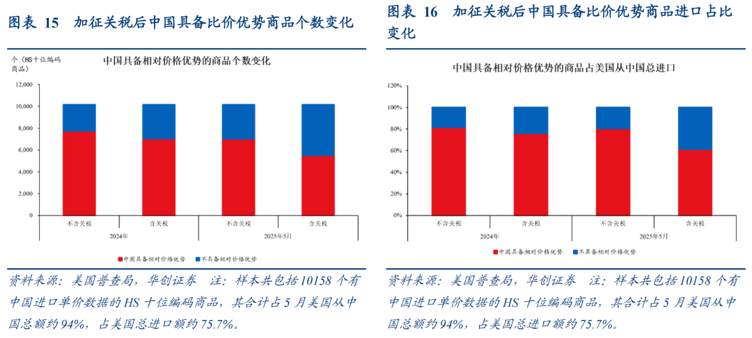 10、比价优势:假设美国对华加征关税且完全由进口商负担,截至5月中国仍具比价优势商品占比约61.4%
