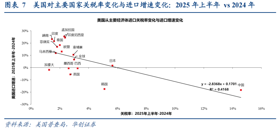 以今年上半年数据为分析基础,美国进口关税率相比于2024年每抬升1个百分点,美国进口同比增速则下降约2.8个百分点。