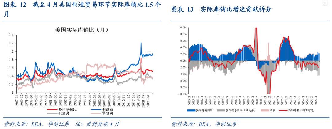 拆分贡献来看,库销比未明显抬升,主要是因为企业补库的幅度不及销售激增的程度。4月单月来看,美国整体实际库销比同比增速-2%(3月为-1.8%),增速似乎并未体现企业抢囤货,主要是因为销售快速增长拖累库销比。4月,实际库存同比贡献2.3%(3月为2.6%),实际销售同比贡献-4.4%(3月为-4.6%,注:销售正增对实际库销比是负贡献)。自去年12月以来,实际库存同比有明显抬升,由去年12月的1.4%升至今年4月的2.3%,3月是阶段高点2.6%;但实际销售同比同步飙升,且幅度更高,由去年12月的2.7%升至今年4月的4.4%,3月为阶段高点4.6%。