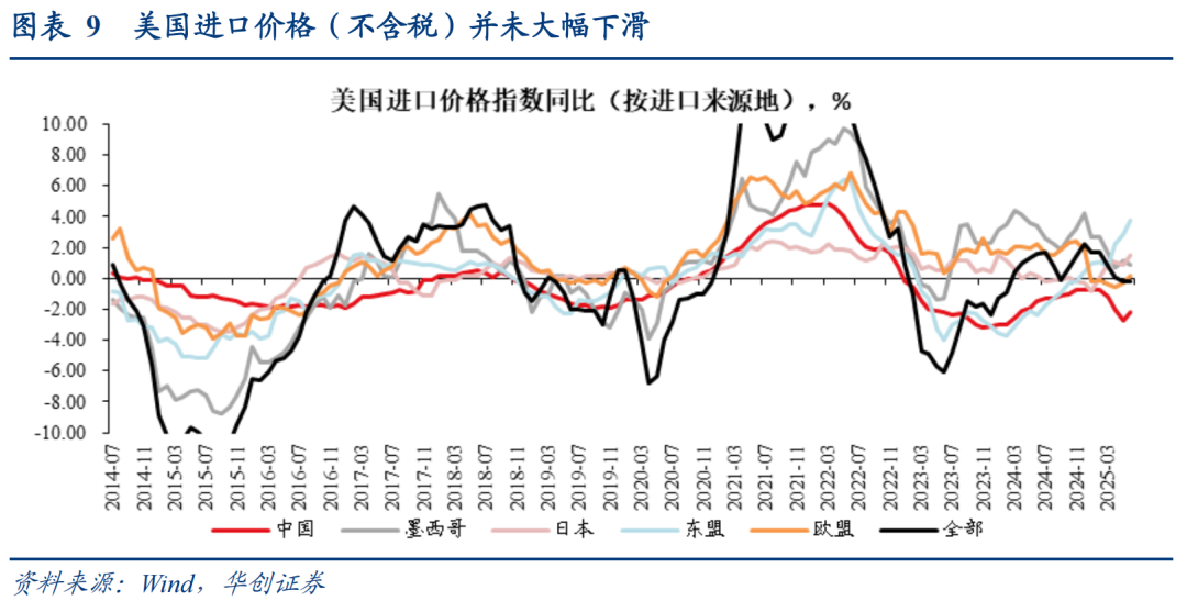 关税并未带来美国不含税进口价格的大幅下滑,意味着大部分关税成本由美国进口商承担。3-6月,美国进口实际有效关税率由3.8%升至8.9%,而进口价格指数(不含关税)同比增速平均0%左右,较为平稳,反映关税成本大多由美国进口商承担。