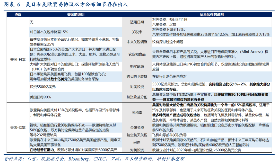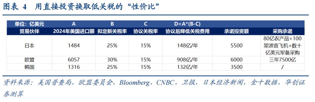 对比承诺投资和采购金额与协议降低关税率带来的成本下降幅度,日本承诺投资额(5500亿美元)似乎远远高于关税率下调的收益(粗糙估算每年节省148亿美元),不过目前关于日本的投资形式和年限尚未经正式文书明确,后续具体如何落地仍有待观察。
