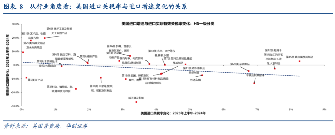 与国别层面数据类似,行业层面美国进口增速与关税率提升幅度呈明显的负相关系。其中,车辆及其零附件、杂项制品、鞋帽伞关税率提升幅度偏高,美国进口增速降幅相对较大。2024年-2025年上半年,鞋帽伞关税率由11.4%升至19.0%,进口增速由5.1%降至2.5%;车辆及其零附件关税率由2%升至8.9%,进口增速由3%降至-10.4%;杂项制品关税率由4%升至10.8%,进口增速由2.7%降至-1.8%。