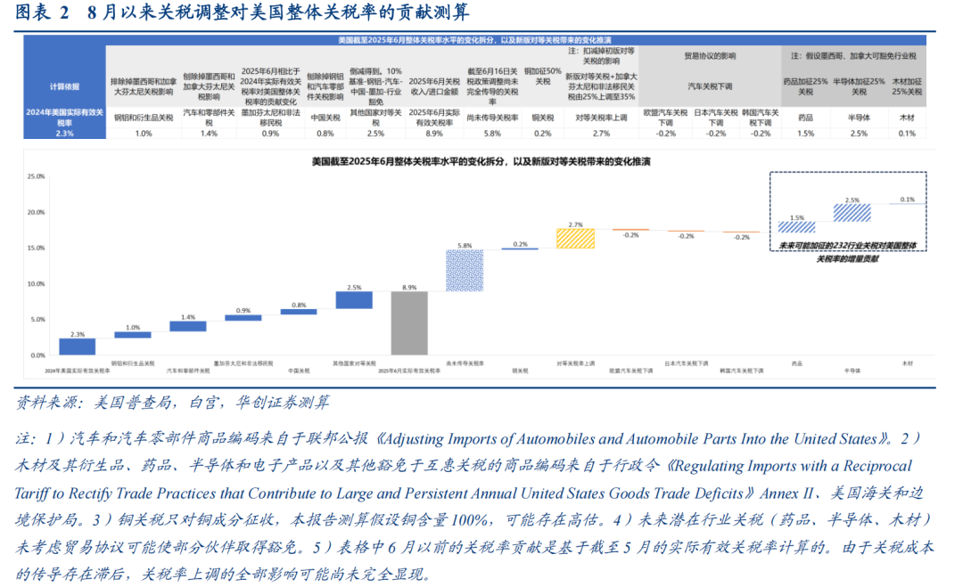 在此基础上测算8月以来关税政策变化以及未来潜在行业关税对美国整体税率的影响,主要重视三大部分: