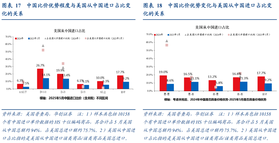 3)通过对比加征关税前后中国比价优势状态变化与美国从中国进口占比的关系,我们发现一个符合直觉的事实:本身不依赖价格优势的商品,韧性偏强。2024年和今年5月中国均不具备比价优势的商品,美国从中国进口占比下滑幅度偏小,由2024年16.8%降至2025年5月11.3%,相比之下,美国整体进口来自中国的比例由2024年17.7%降至2025年5月9.2%。