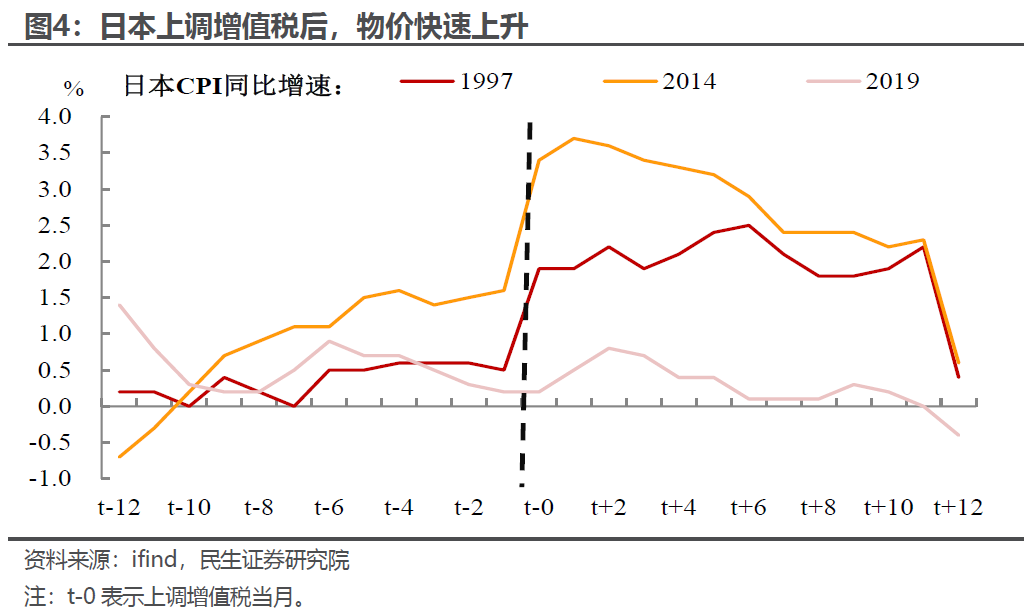 日本增值税上调(货币政策宽松背景下)。复盘历史,日本增值税共进行三轮调整(分别是1997、2014、2019年),共使得增值税率由3%上升至10%,为我们研究价格冲击的持续性提供了丰富的参考案例。可以看到,在日本三次上调增值税后,价格端立即响应,CPI同比增速短期明显上升。
