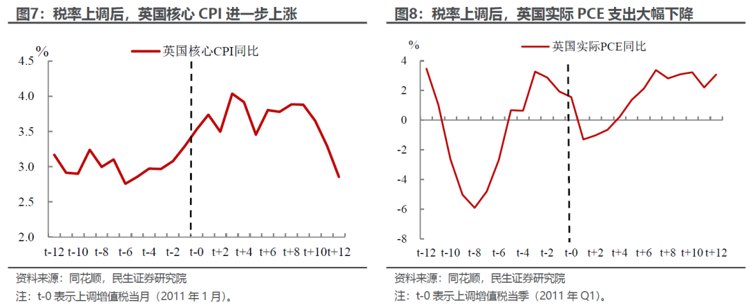 英国增值税上调(货币政策偏紧背景下)。2011年1月,英国将增值税从17.5%提高到20%,导致本已处于上升趋势的通胀骤然加剧。虽然英央行将其视为暂时性的冲击,但也担心通胀预期上升可能导致更持续的通胀。英国内部也基本呈现出两派观点,一派认为英央行应采取大步伐的加息行动,否则将丧失抑制通胀的可能性,但也有人认为英国经济复苏远未达到稳定的地步,当前加息太早。最终英央行选择保持利率水平不变,而随着增值税带来的真实支出放缓,通货膨胀也在不久后触顶回落。