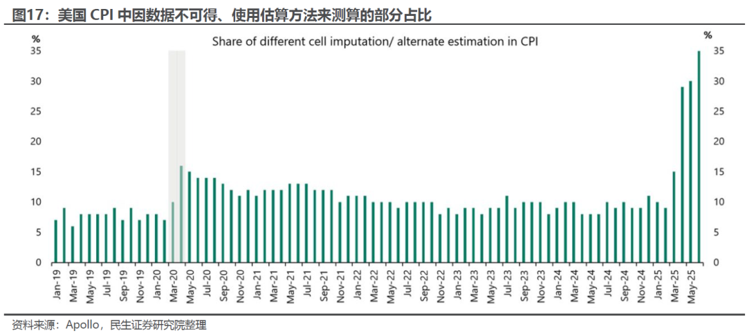 其次,如何全面、及时评估关税对通胀的影响?今年以来追踪通胀数据变化可能比以往更为困难,联邦政府的预算削减和裁员使得外派搜集数据的人员不足,统计工作量和估算比例大幅上升,这一定程度上放大了数据的波动性,导致精细度和准确性降低。