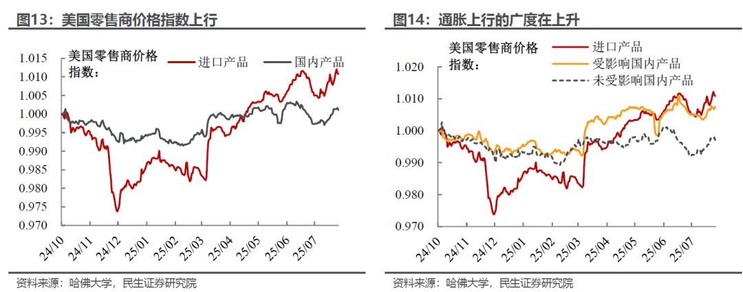 但我们从美国大型零售商的产品价格(哈佛大学测算)可以观察到一些端倪,7月以来美国大型零售商开启新一轮涨势。而且从结构上来看,本轮上涨的范围更加广泛:无论是美国进口商品还是国内本土制造商品、受关税影响还是未受影响的商品价格均同步上行(与4-6月的分化特征有所不同),这反映出通胀上涨和广度在显著上升。