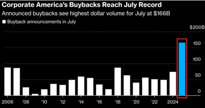 最新的内部人士沽售和企业回购数据,正好印证了这种脱节现象。今年7月,标普500公司宣布的回购金额高达1660亿美元,创下7月份历史新高。