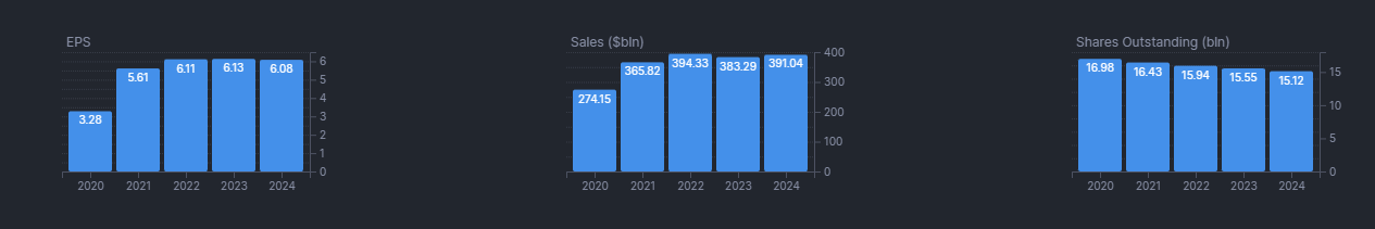 这番话相当中肯。回购确实能制造盈利增长的假象,因为每股盈利会随着流通股数减少而上升,如下图所示。